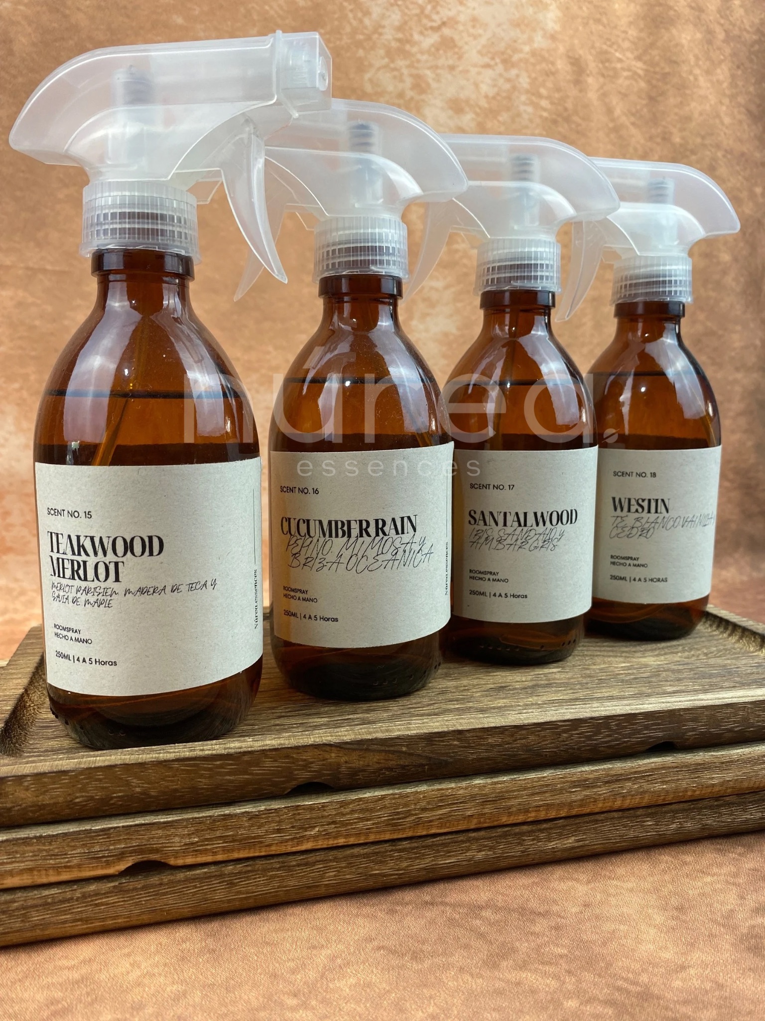 Roomsprays en frascos ámbar de 250ml con atomizador.
