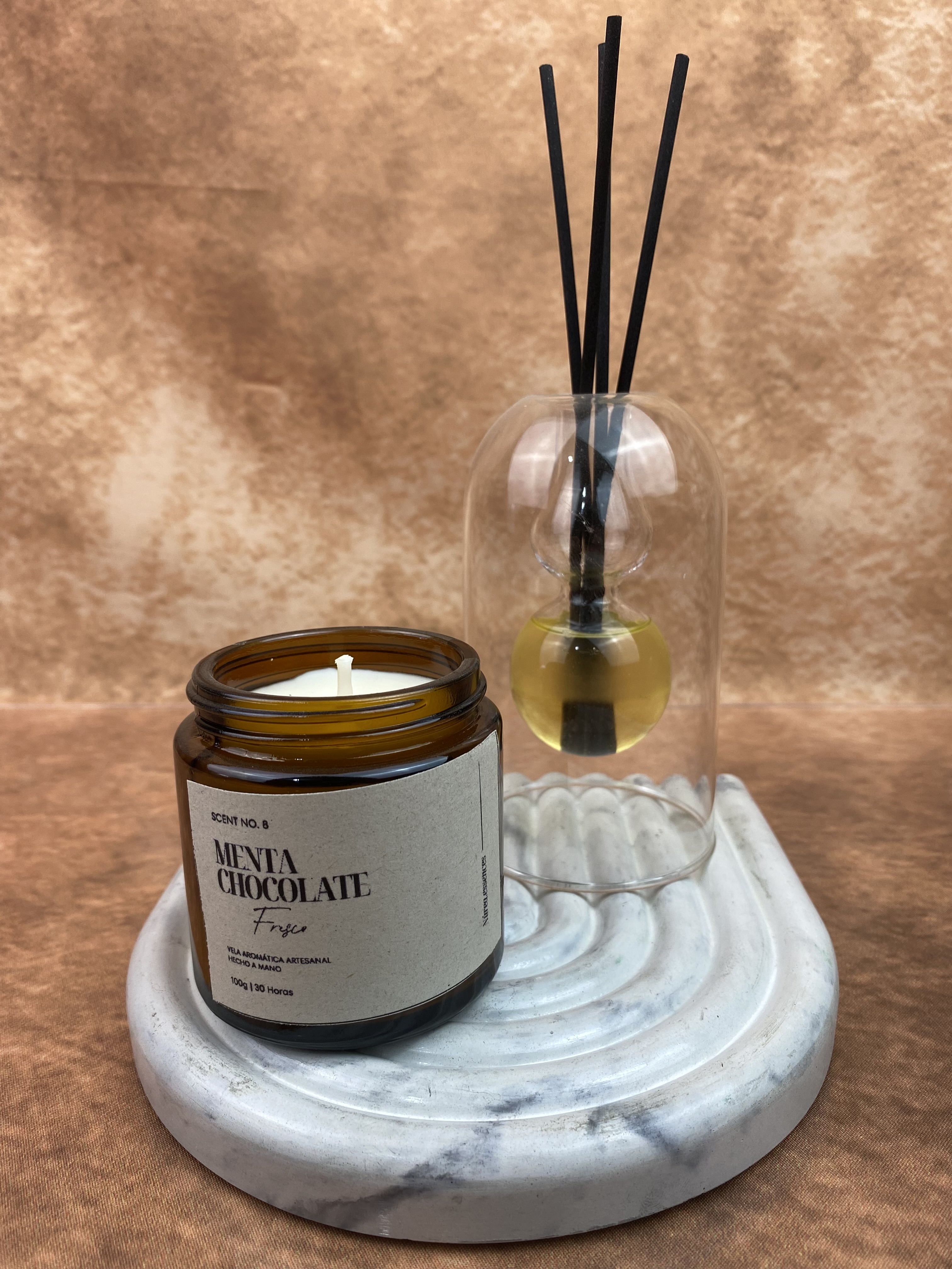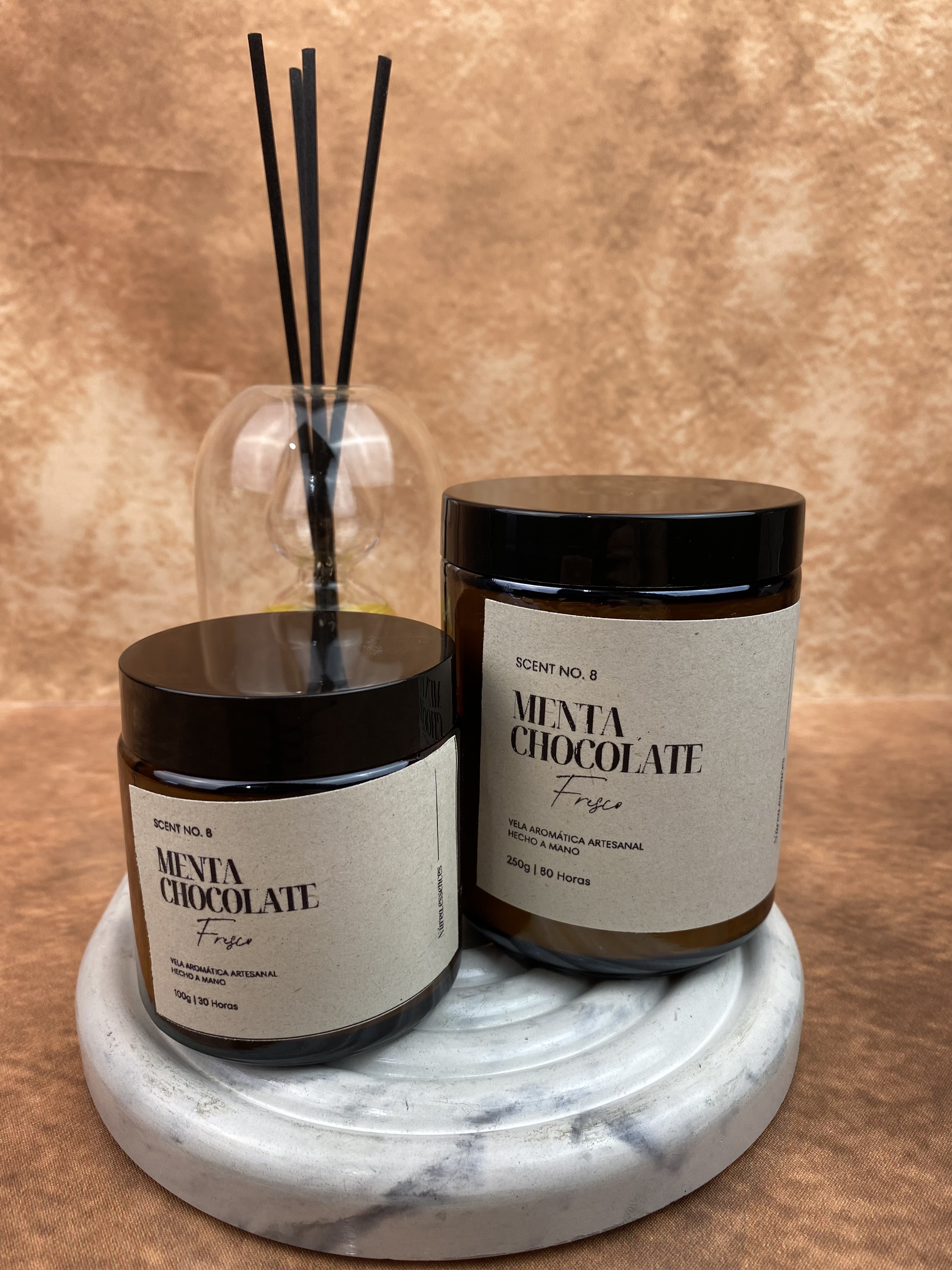 Esta vela de Menta Chocolate es una exquisita fusión de frescura y dulzura,